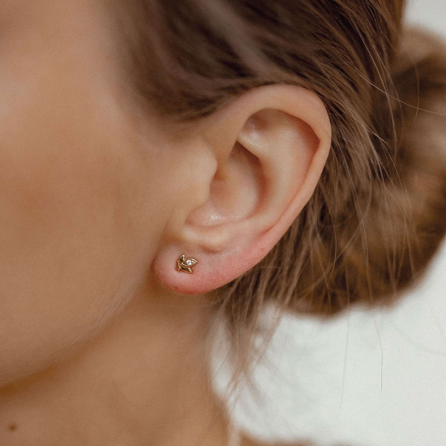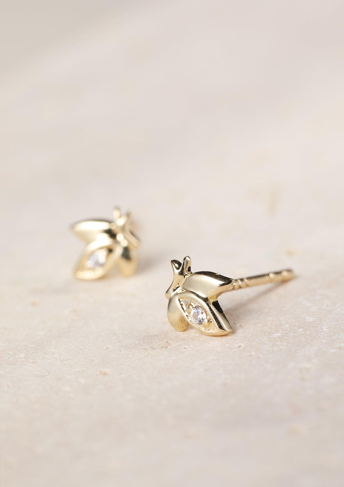 Representing transformation, joy, and rebirth, our 9 karat 375 solid gold Awaken Stud Earrings feature a playful butterfly design, depicted on its side with two wings, a tiny zirconia set into its lower wing. A lively pair of earrings encouraging you to brighten up your life, maybe even to take the opportunity to express yourself fully and awaken your true inner self—your own butterfly—ready to take flight.