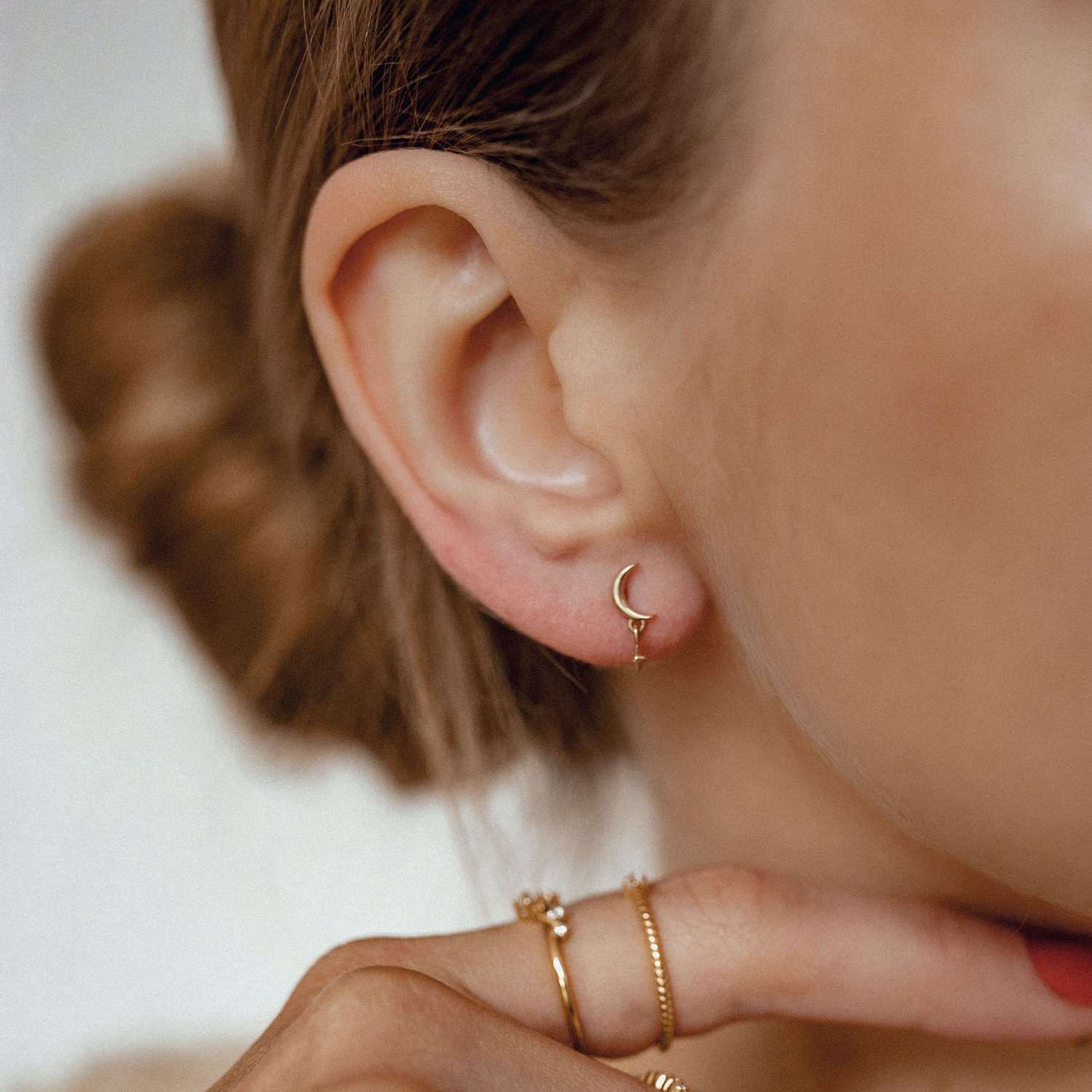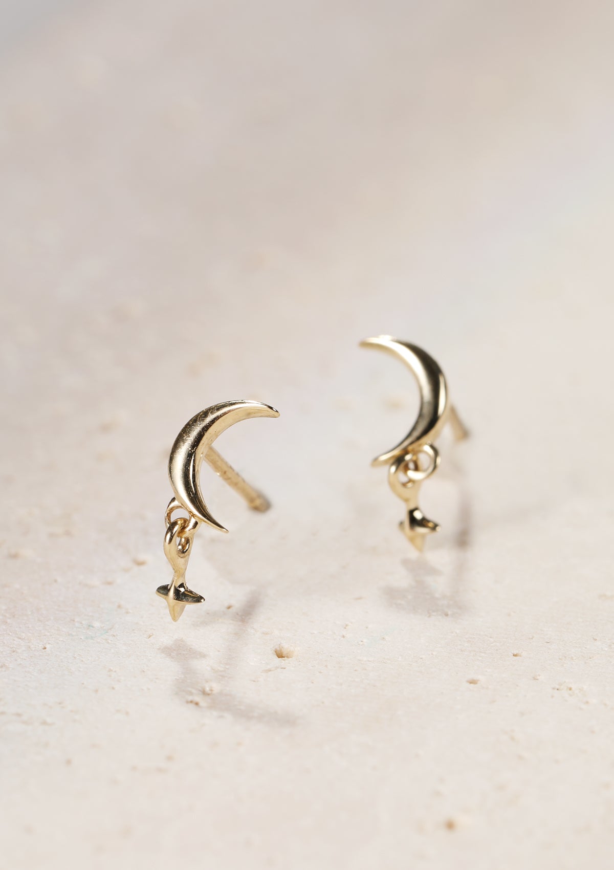 A crescent moon has long been a symbol of positivity and hope, and is seen as a sign of good luck when it appears in the night sky. The same can be said for our 9 karat 375 solid gold Celestial Studs, with their smooth crescent moon and mini star charm dangling from their lower edge. This is a heavenly pair of earrings designed to fill you with courage, focus, and to encourage you to dream big.